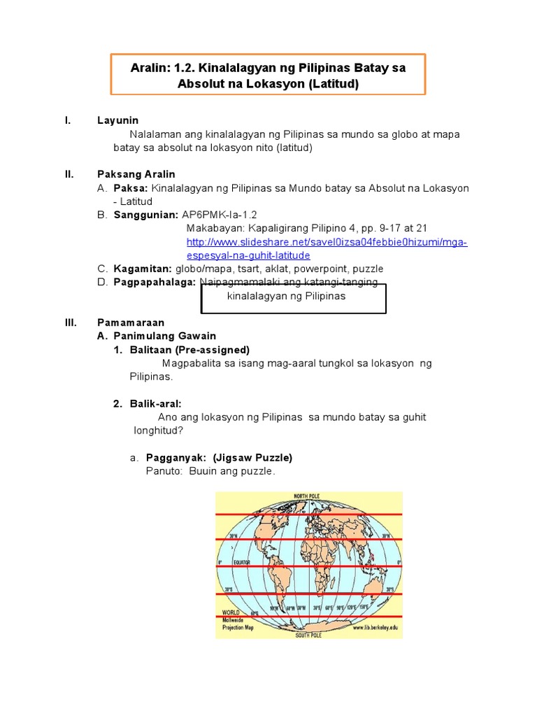 Malaking tulong din ang paghanap ng lokasyon ng isang bansa kung alam ang kinalalagyan ayon sa guhit longitud. Ang tiyak na lokasyon ng pilipinas sa mundo sa globo at mapa na gamit ang longhitud at latitude ay 6 23 - 21 25 hilagang latitude at 1 16 - 127 silangang longhitud. Paksang Tatalakayin Kahulugan ng Lokasyon Uri ng Lokasyon Paggamit ng Likhang Guhit ng MapaGlobo sa Absolutong Lokasyon Paggamit ng Direksyon sa Relatibong Lokasyon 3.