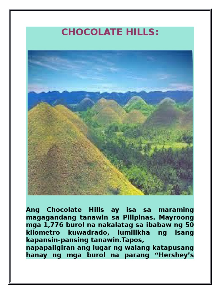 Saan Lugar Matatagpuan Ang Chocolate Hills Dipublikasikan oleh ruslan Sabtu, 08 Mei 2021 Magagandang Tanawin Sa Pilipinas Ang Chocolate Hills Ang Isa Sa Pangunahing Different Places In The Philippines Pdf Show comments Hide comments Tidak ada komentar