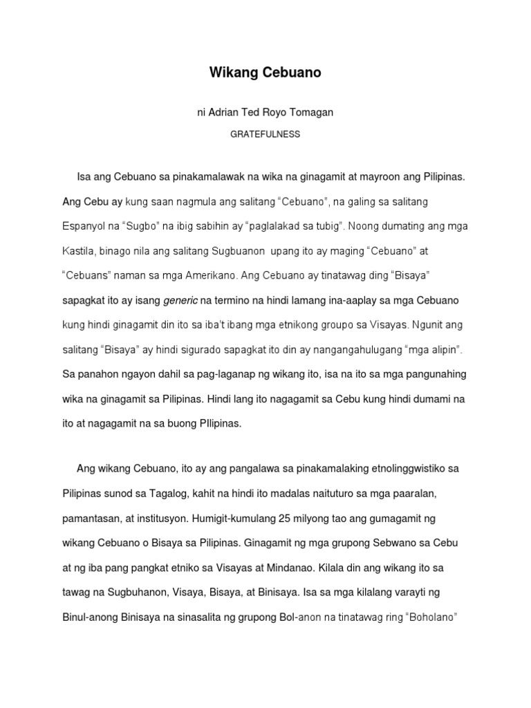 Saan nagmula ang wikang cebuano. Mga Cebuano at Wikang Ingles Tumingin ng iba pang Wikang Kastila. Nagsimula ang pagdiriwang ng Buwan ng Wika noong Enero 15 1997 sa bisa ng Proklamasyong Bilang 1041 ni. Nailimbag ang Cebuano for Beginners ni Maria.